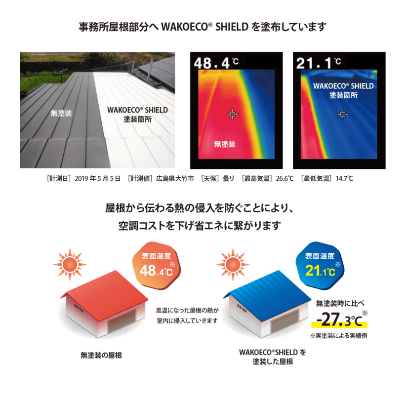 一般的に夏場の室温3℃の低減で、約15%の節電が可能と言われています。WAKOECO® SHIELDを塗布することで、屋根表面温度を20℃以上、室温3℃以上の低減が可能です。建物内の温度上昇を抑制することで、冷房費の節電効果が見込まれます。